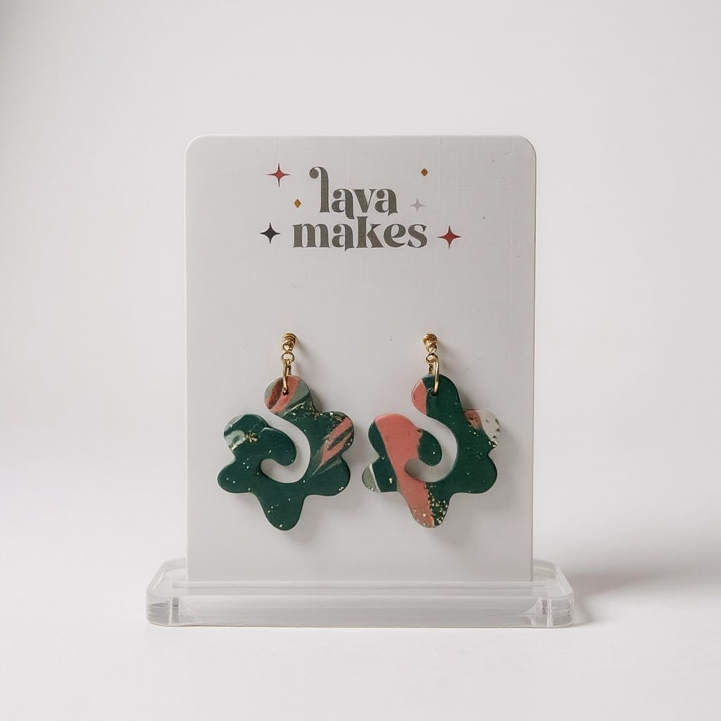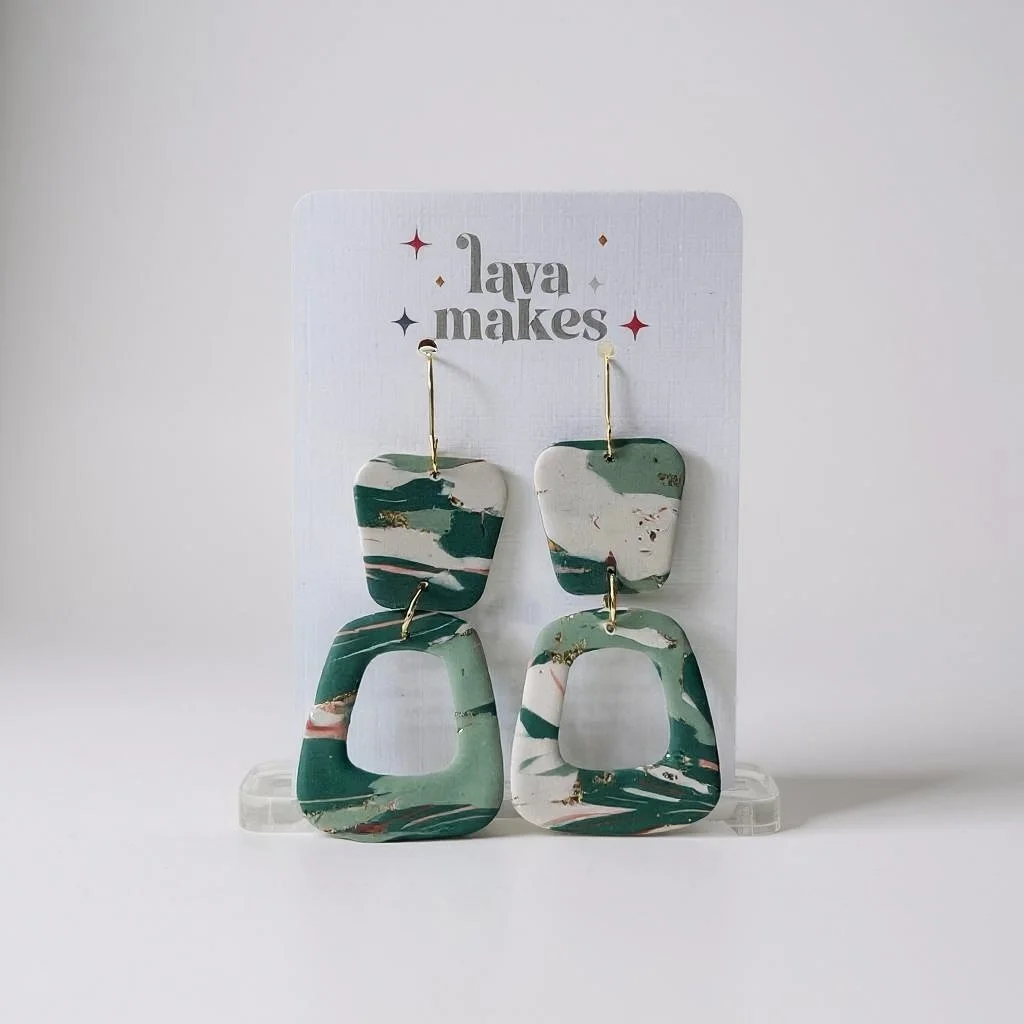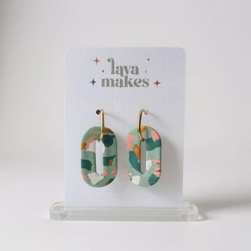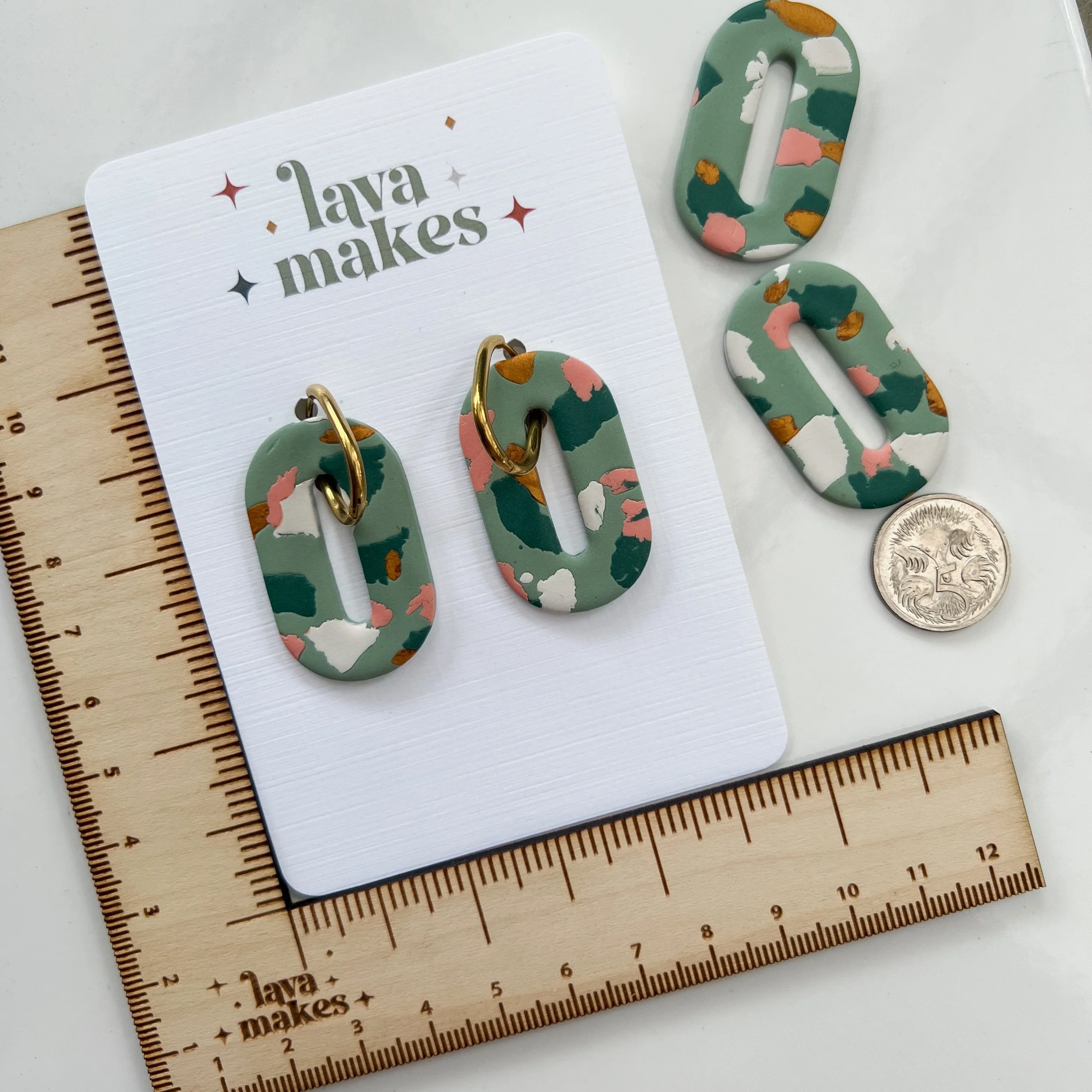 Abstract Terazzo Dangly Stud Earrings in Smokey White and Misty Sage